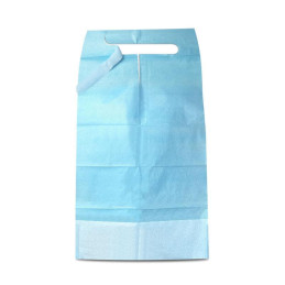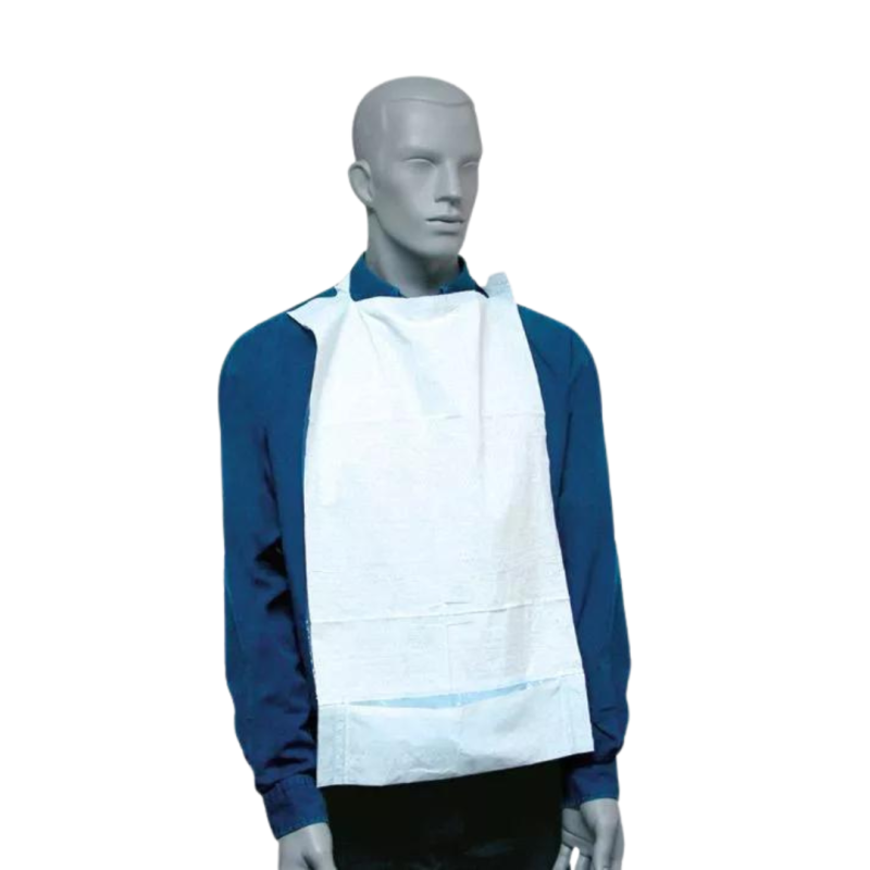 Babero desechable de celulosa y polietileno. Con bolsillo para residuos. Talla única. Para su uso en residencias, hospitales y geriátricos. Impermeable.